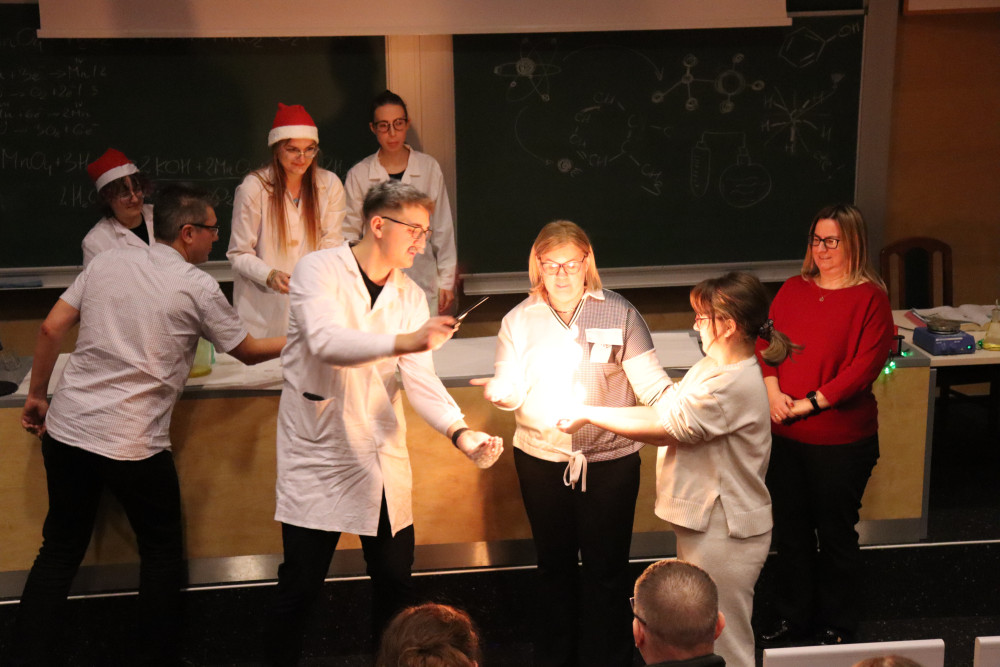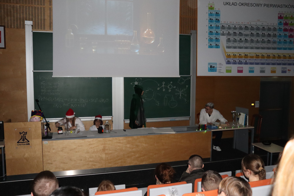 Centralnym punktem programu była świąteczna opowieść inspirowana „Opowieścią wigilijną” Charlesa Dickensa. Jej bohaterem był zrzędliwy i niezbyt przyjazny światu profesor chemii Ebenezer Schroodge, który początkowo nie wierzył ani w świąteczną atmosferę, ani w radość płynącą z dzielenia się wiedzą. W trakcie niezwykłej historii profesor przeżył serię zaskakujących wydarzeń, które – podobnie jak w klasycznej opowieści Dickensa – skłoniły go do refleksji i przemiany. Jak przystało na wigilijną opowieść, mimo pojawiających się trudności wszystko dobrze się skończyło, a finał historii wywołał uśmiechy i radość wśród uczestników.